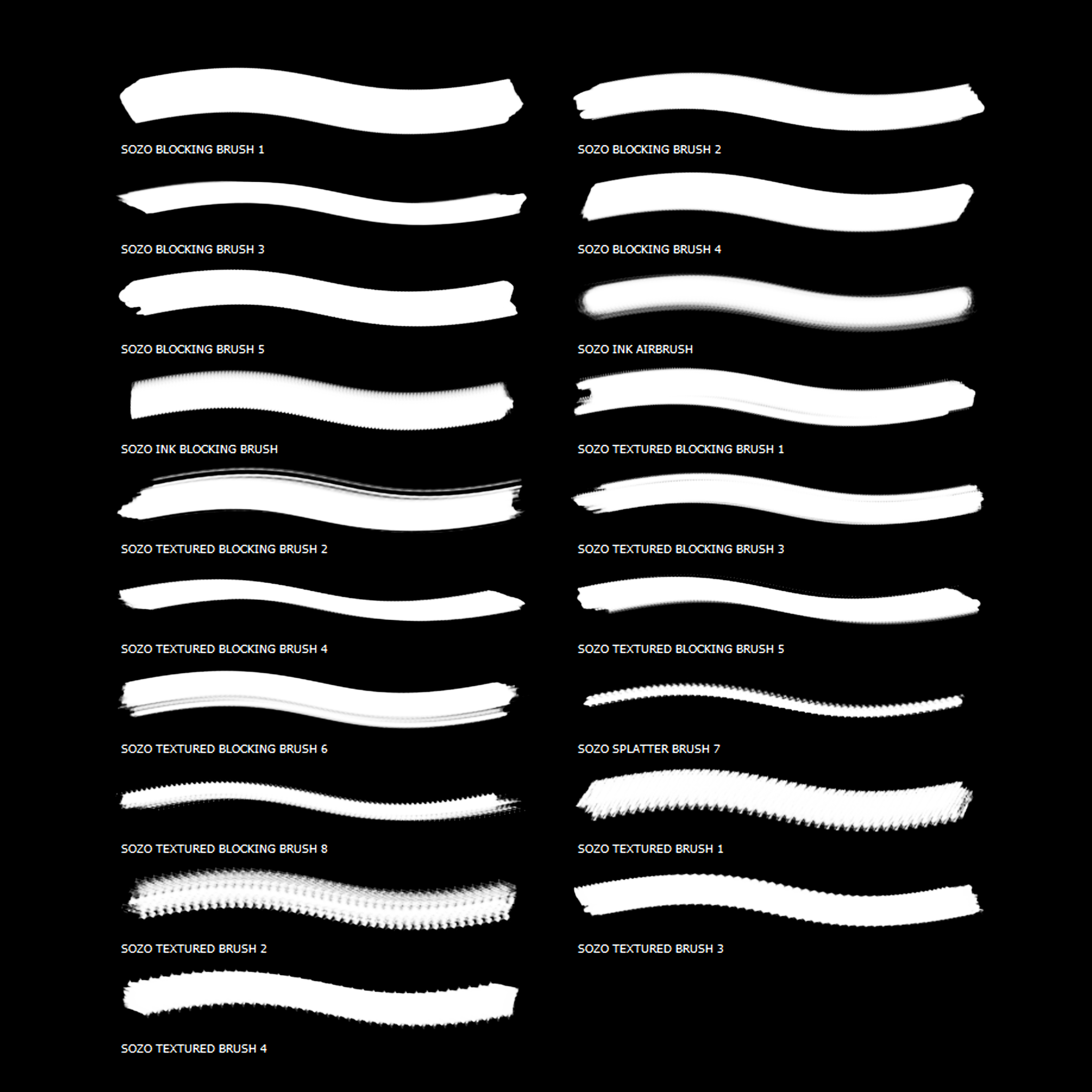 I've custom made a set in the vain of what I'm typically comfortable working with. Each brush was individually designed with a real ink brush, scanned in and tweaked to my liking. I hope you like them too!